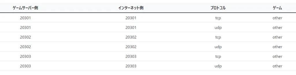 ※このゲームは設定した値と異なるポートを使って通信を行っていますので、設定値から二つ飛ばした先の値もポート開放が必要です。