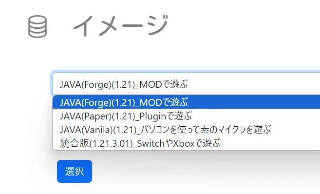 現在、バージョン1.21ベースのイメージをそろえています。遊びたいイメージを選んでください。