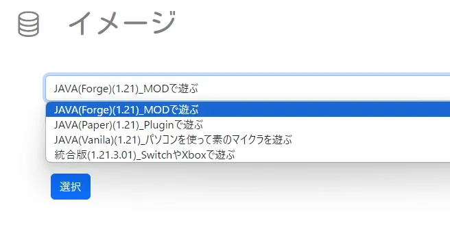 現在、バージョン1.21ベースのイメージをそろえています。遊びたいイメージを選んでください。
