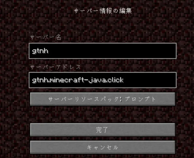 いつものマイクラ接続画面になりますので、準備したサーバーのアドレスを登録します。