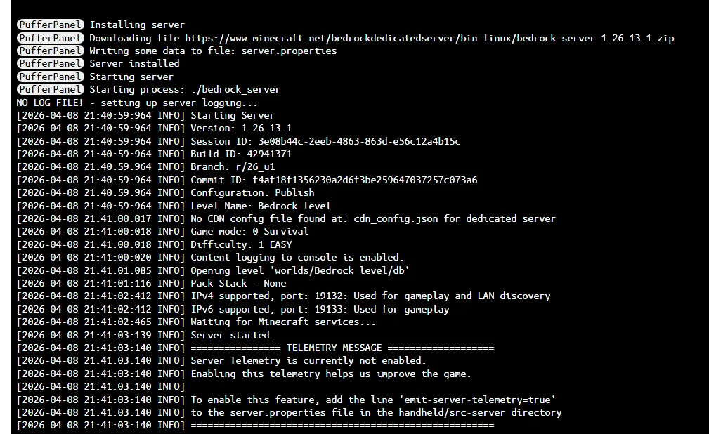 Installing server Downloading file https://www.minecraft.net/bedrockdedicatedserver/bin-linux/bedrock-server-1.26.13.1.zip Writing some data to file: server.properties Server installed