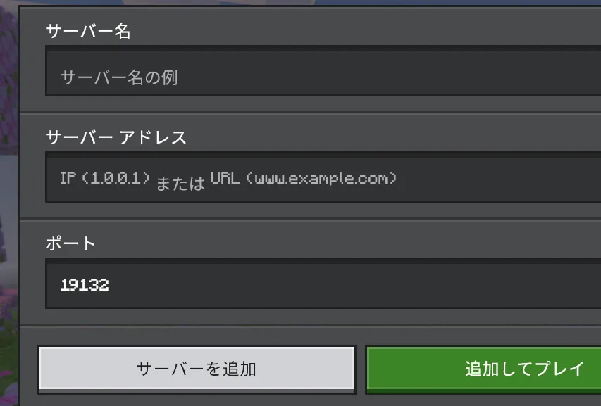 あとは、いつも通りマイクラを起動して「マルチプレイ」へ進み、「サーバーを追加」から確認したアドレスを入力するだけ。