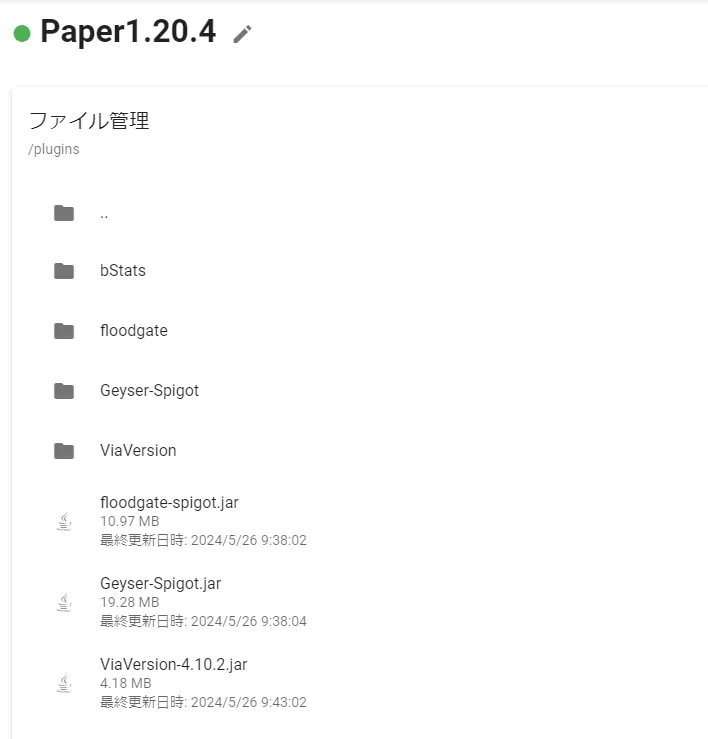 アップロードが完了したらプラグインを読み込ませるためサーバーを再起動します。