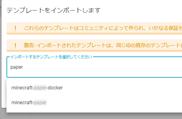 テンプレート一覧ボタンより、Paperのテンプレートを入手します。