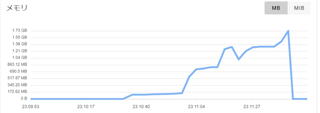 途中、再起動を挟み・・・・・ メモリが以下のようにがくんと下がるタイミング来たら、改めて起動を押してください。