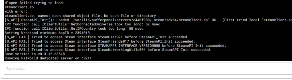 steamclient.so: cannot open shared object file: No such file or directory [S_API] SteamAPI_Init(): Loaded ‘/var/lib/pufferpanel/servers/c446f980/.steam/sdk64/steamclient.so’ OK. (First tried local ‘steamclient.so’) IPC function call IClientUtils::GetConnectedUniverse took too long: 52 msec IPC function call IClientUtils::GetIPCountry took too long: 50 msec Setting breakpad minidump AppID = 2394010 [S_API FAIL] Tried to access Steam interface SteamUser021 before SteamAPI_Init succeeded. [S_API FAIL] Tried to access Steam interface SteamFriends017 before SteamAPI_Init succeeded. [S_API FAIL] Tried to access Steam interface STEAMAPPS_INTERFACE_VERSION008 before SteamAPI_Init succeeded. [S_API FAIL] Tried to access Steam interface SteamNetworkingUtils004 before SteamAPI_Init succeeded. Game version is v0.3.12.63518 Running Palworld dedicated server on :8211
