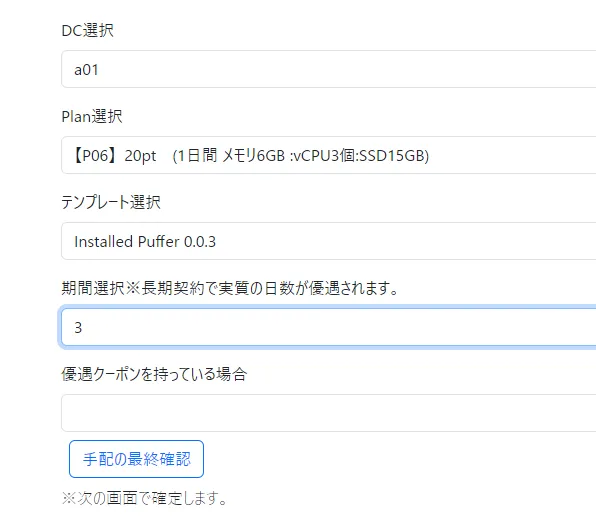 注意点として、テンプレートは Installed Puffer を選択してください。