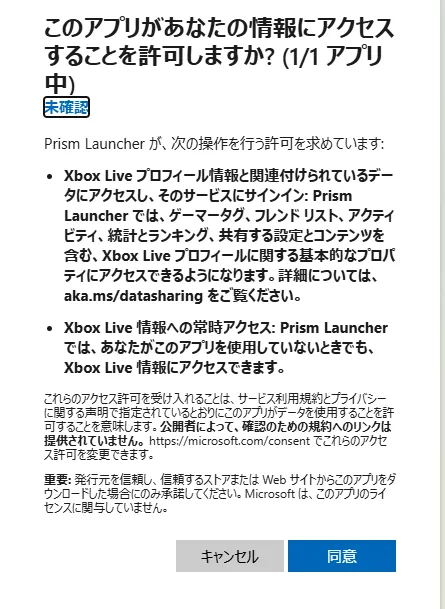 ここは人によって画面遷移が異なると思いますが、最終的には以下の画面にたどり着くと思います。普段、マイクラを利用しているアカウントである事を確認したら同意してください。※自己責任です。