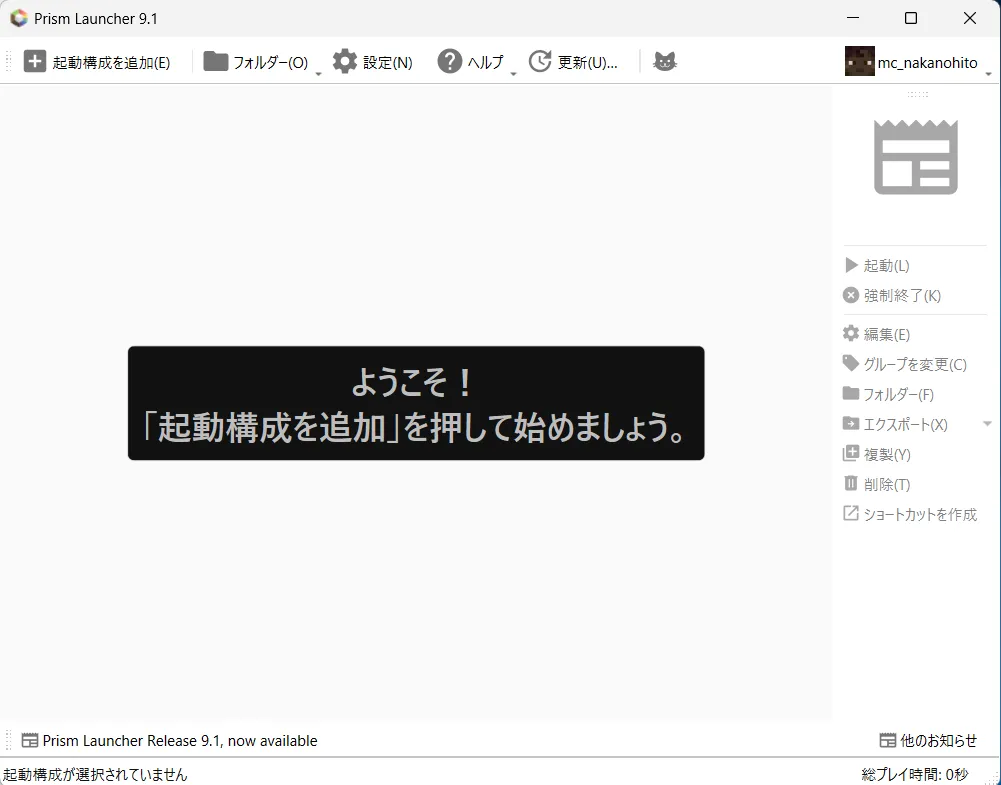 問題無ければ以下の画面になります。※画面右上に普段マイクラで利用しているアカウントが表示される事を確認してください。