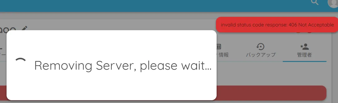 「Removing Server, please wait...」というローディング表示の後、赤いバナーで以下のエラーが表示されます。