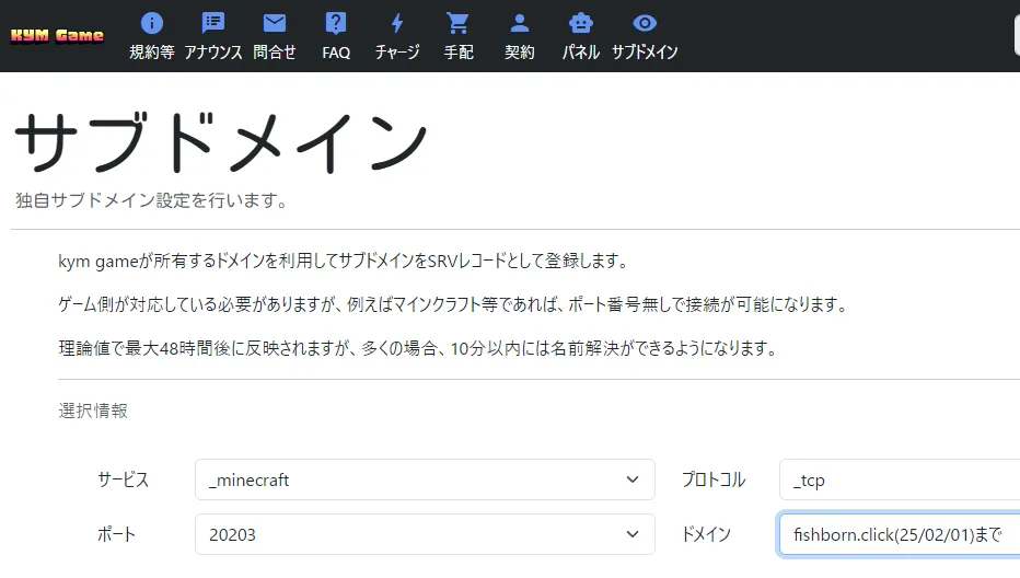 新環境が正常に動作している事が確認出来たら kym game のサブドメインボタンよりSRVレコードを登録していきます。